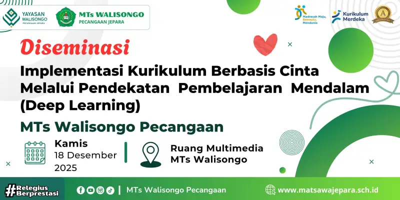 MTs Walisongo melaksanakan kegiatan Khotmil Qur’an bulanan yang dirangkaikan dengan diseminasi Kurikulum Berbasis Cinta dan deep learning pada Kamis, 18 Desember 2025. Kegiatan ini berlangsung di Ruang Multimedia Yayasan Walisongo mulai pukul 09.00 WIB hingga selesai.